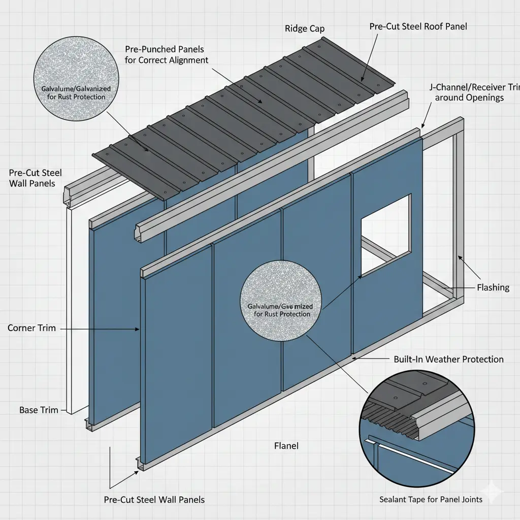 The exterior system is what protects your 30×60 steel building from rain, wind, and sun. A complete kit should arrive with all the parts needed to seal the structure tightly.