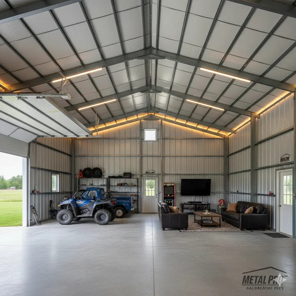 Steel buildings are ideal for this dual-purpose design because their clear-span interiors provide wide, open space with no interior posts. You can park an ATV, truck, or mower on one side and set up a couch, TV, or game area on the other. Everything stays organized, dry, and secure.