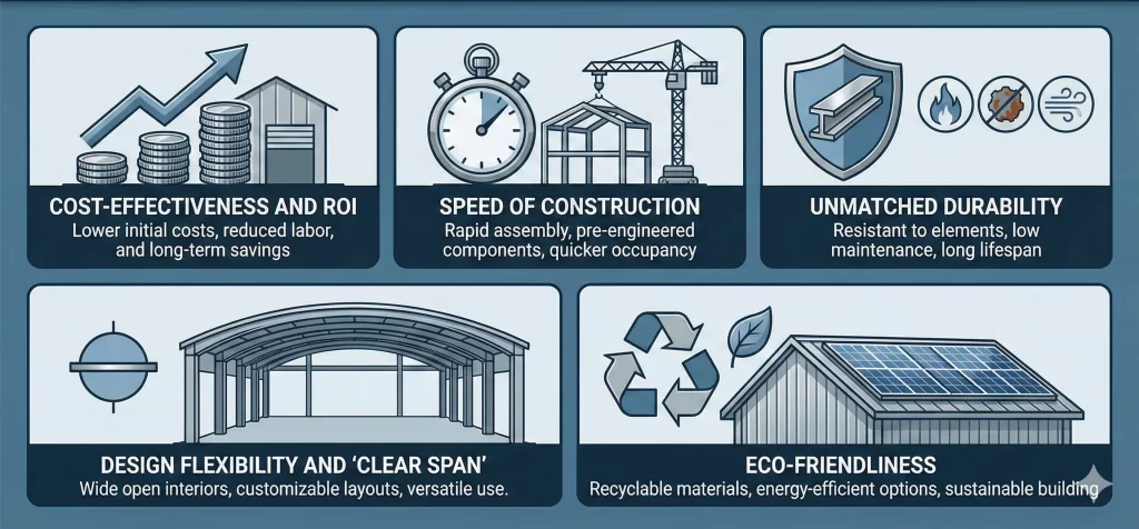 - Column-Free Interiors: Steel is so strong it doesn’t need support columns in the middle of the room. This is called “Clear Span.” You can have an open space up to 300 feet wide.