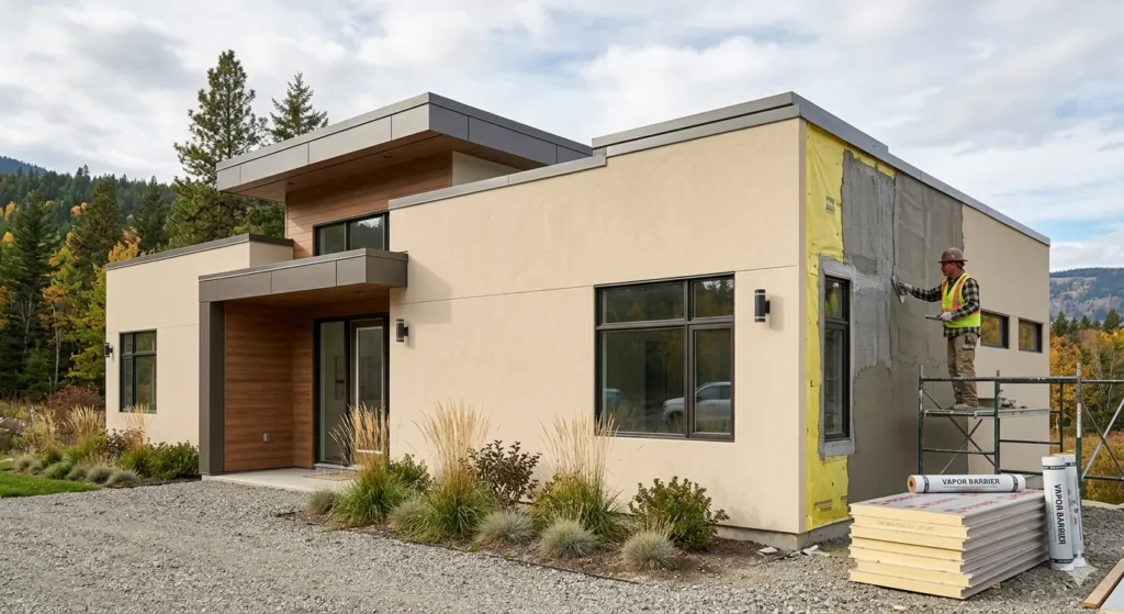 Stucco and EIFS (Exterior Insulation and Finish Systems) are applied over insulated panels to create a smooth or textured exterior surface.