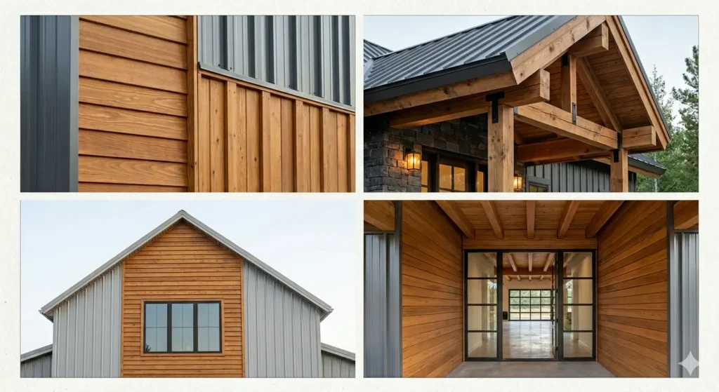 Wood brings warmth that no other material quite matches. Engineered wood siding, shiplap, board-and-batten, and exposed timber beams are all popular choices for metal building exteriors.