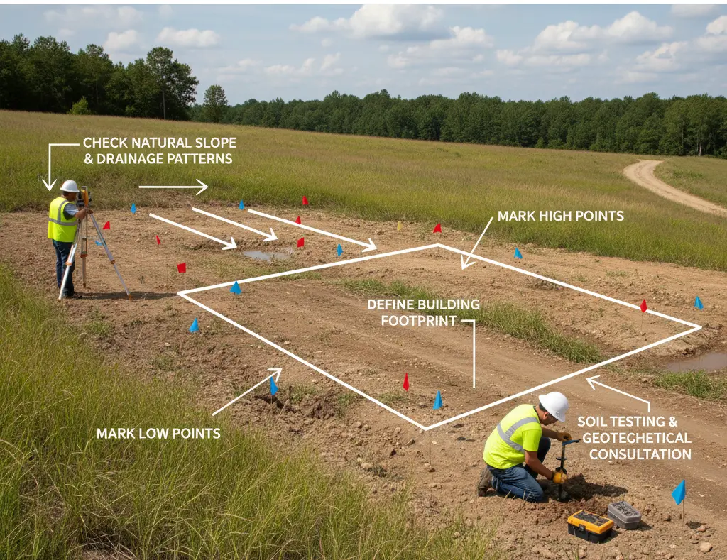 - Mark the site’s highest and lowest spots, especially low points where water may pool. That helps plan drainage or slope away from the structure.