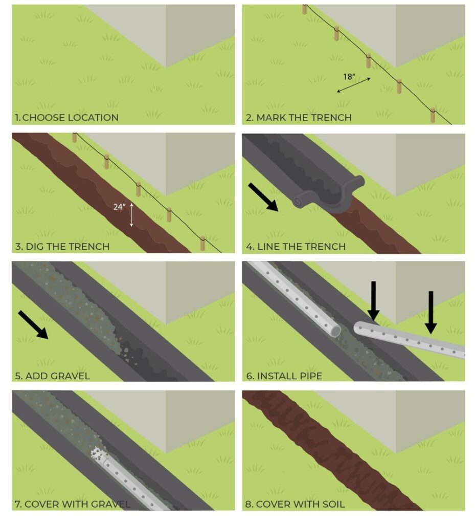 - Installing subsurface drainage such as French drains, perimeter drains, or culverts.