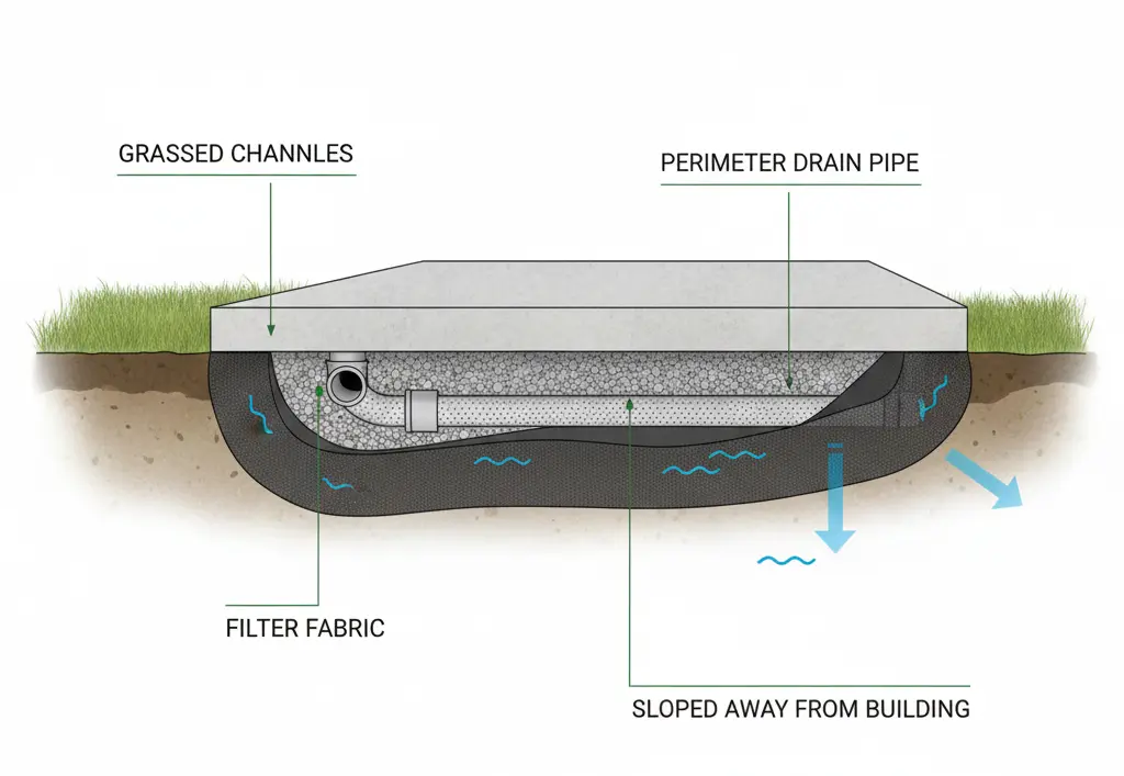 Surface-grade drainage might not handle heavy rains, groundwater, or soil seepage. Skipping subsurface drainage (like perimeter drains or drain tiles) leaves the slab vulnerable.
