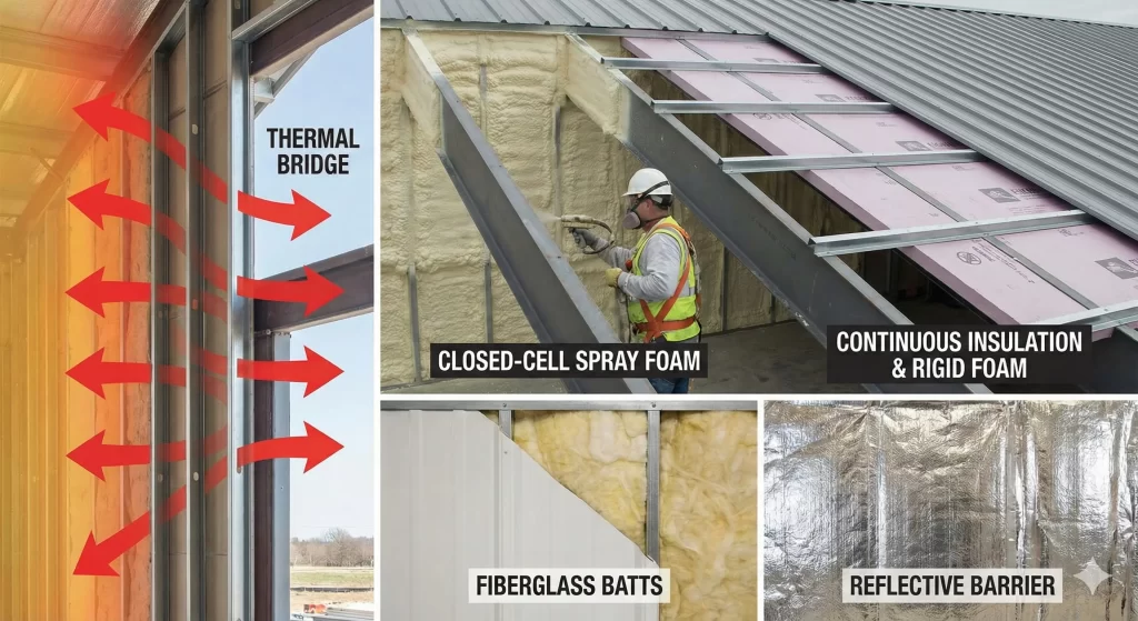 If you want an efficient steel building, you have to stop “thermal bridging.” This happens because steel conducts heat 400 times faster than wood. Every steel stud and rafter acts like a bridge, letting heat sneak past your insulation.