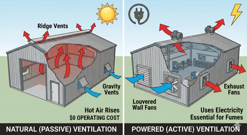 - Active (Powered): Louvered wall fans or exhaust fans use electricity to pull fresh air through the building. These are essential for shops where you use chemicals or welding equipment.