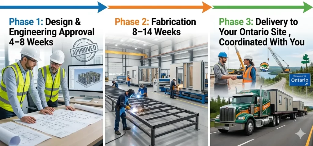 After your engineering drawings are approved, plan for 8–14 weeks for your steel kit to be fabricated and delivered to your Ontario site. That’s your production and shipping window and it’s a real number, not a best-case guess.